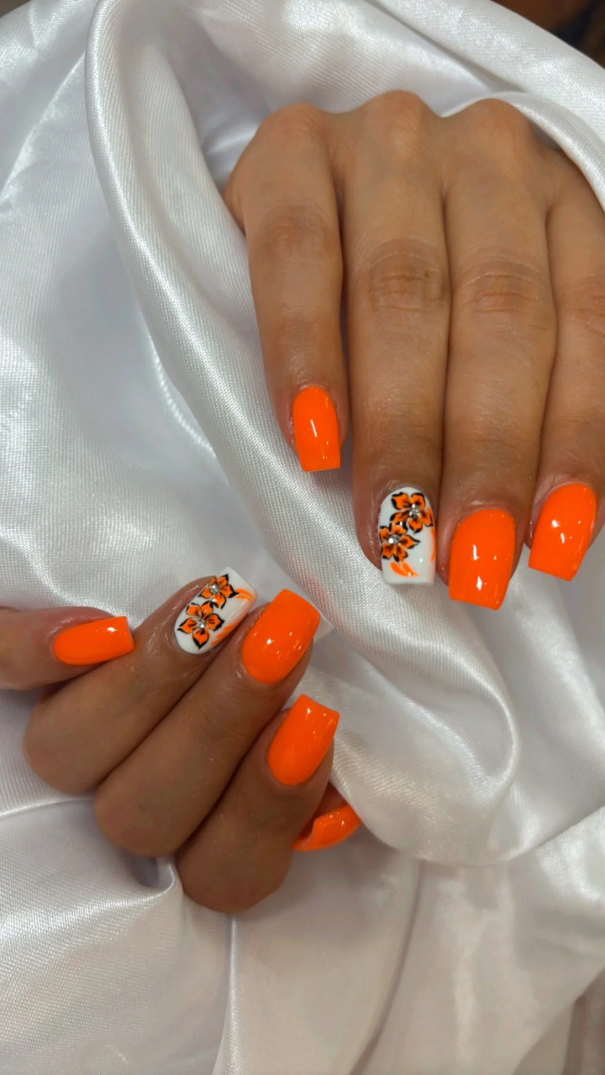 Nail art featuring bright orange polish on some nails and floral designs with white flowers and green leaves on others, against a satin fabric background.