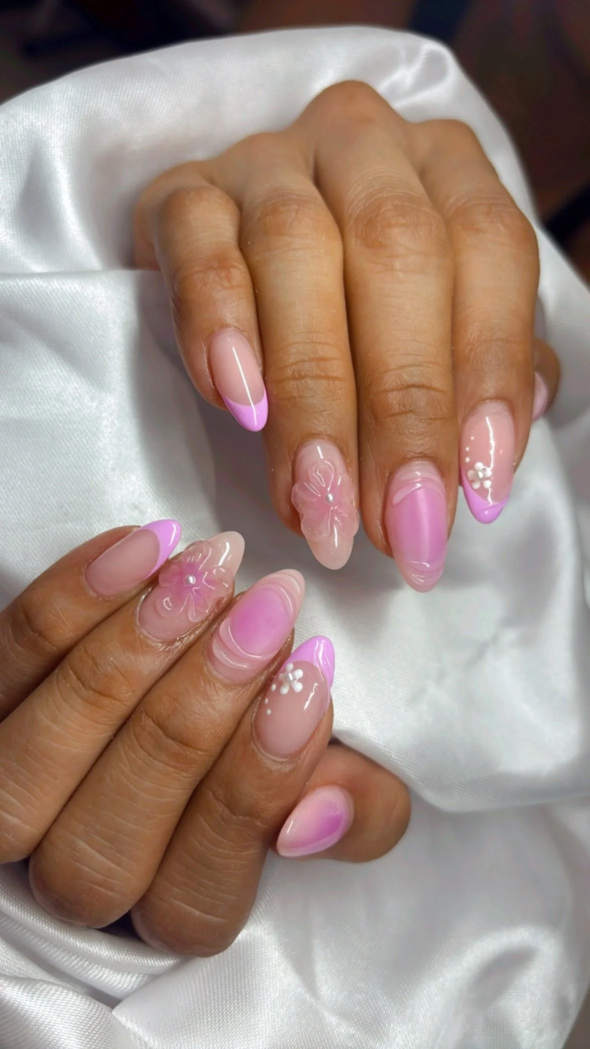 Close-up of hands with pink and white French manicure, featuring floral and pearl nail art on some nails, resting on white satin fabric.