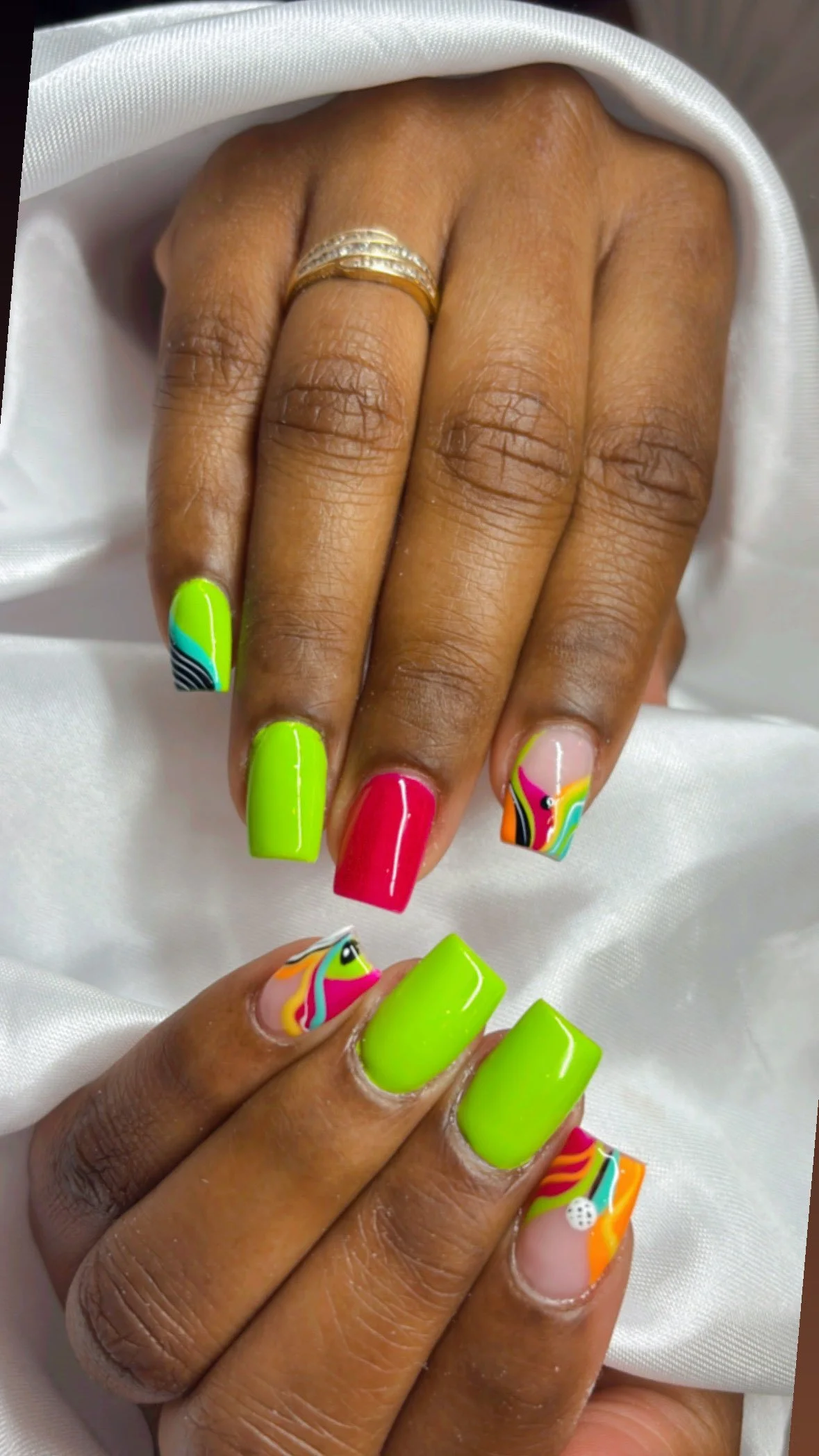 Colorful and vibrant nail art on well-manicured fingers with neon green, pink, and multi-colored designs.